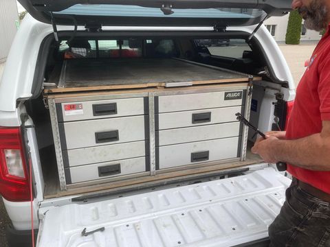 Die Fahrzeugeinrichtung ist genau auf die Maße des VW Amarok abgestimmt. Die genauen Abmessungen können auf den beigefügten Fotos eingesehen werden.