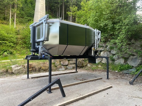 Hochkippmulde für Asphalt, Wechselsystem Wohlgenannt HKM/010, Vollisolierung, hydraulisch betätigter Muldendeckel und Heckklappe, Aufstiegsleiter hinten links, Dieselsptritze mit Chromstahl Behälter, Funkfernsteuerung inkl. Ladegerät